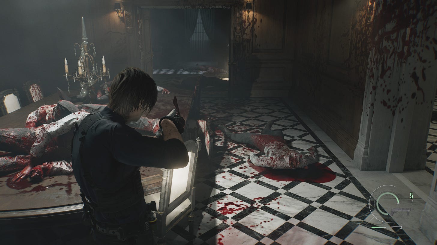 Passer de lâun Ă lâautre, revient Ă basculer de Massacre Ă la Tronçonneuse Ă Evil Dead II. Non content de changer de perspective (vue subjective pour Grace, vue Ă la 3Ăšme personne pour LĂ©on, mĂȘme si le choix final vous revient), Requiem sâamuse Ă rĂ©guliĂšrement briser le rythme et le ton du jeu. Je pense que la rĂ©action (Ă©pidermique) qui dĂ©finit le mieux notre expĂ©rience en tant que joueuse ou que joueur, est celle du âah ouais quand mĂȘme !!â lĂąchĂ© suite Ă une sĂ©quence joyeusement gore, entre la surprise matinĂ©e de dĂ©goĂ»t et lâamusement complice.