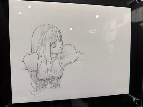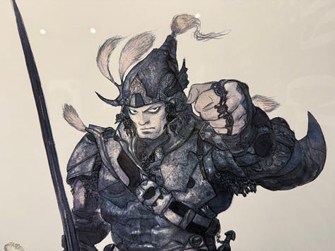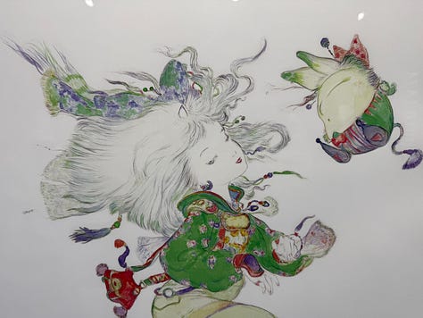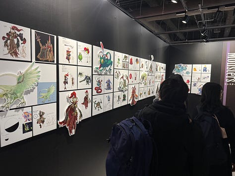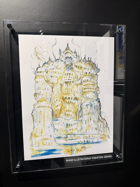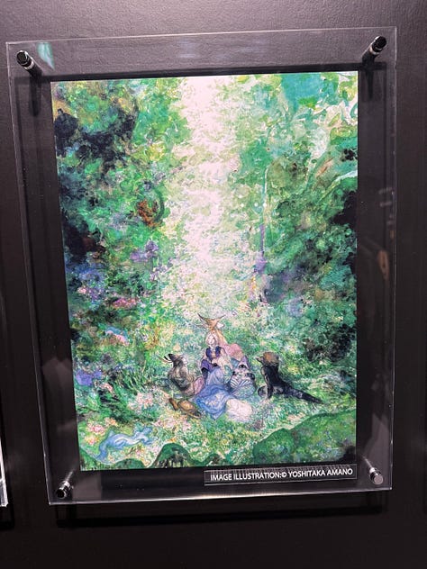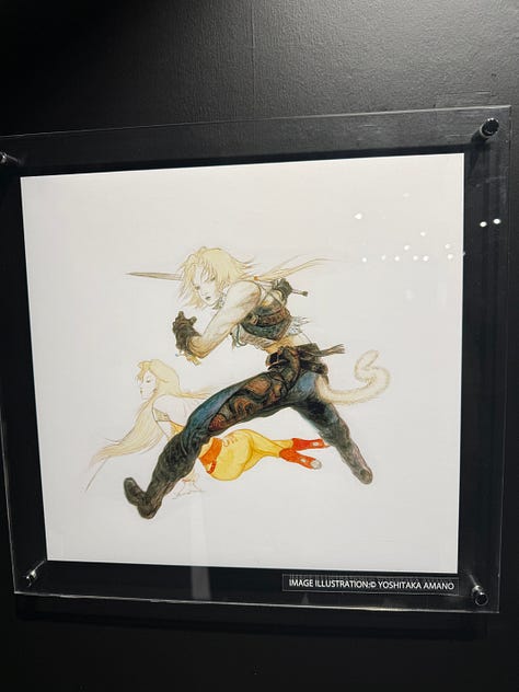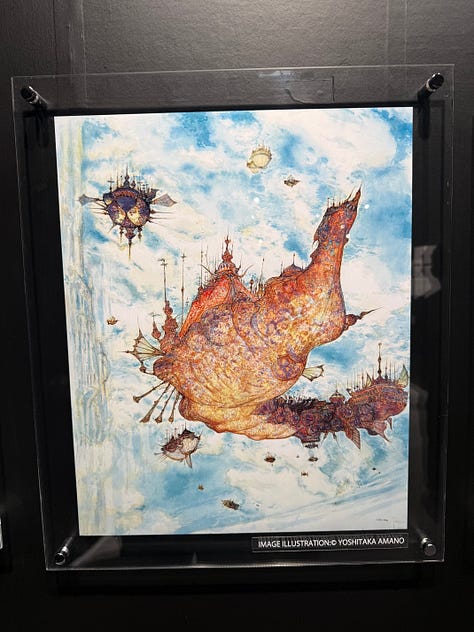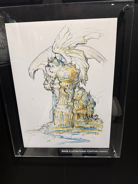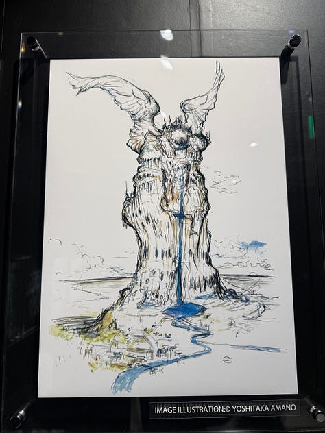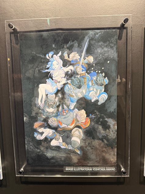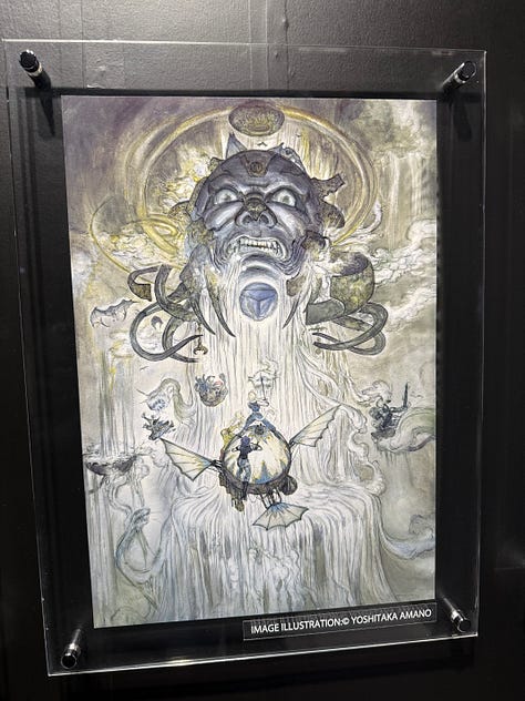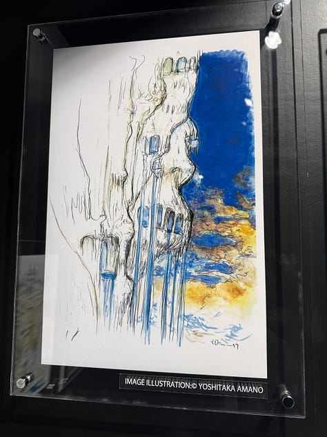 Au character design du jeu, toujours l’immense Yoshitaka Amano. L’exposition qui s’est tenue à Tokyo au Yurakucho Marui, du 22 novembre au 7 décembre, s’ouvrait sur les sublimes dessins de l’artiste.
