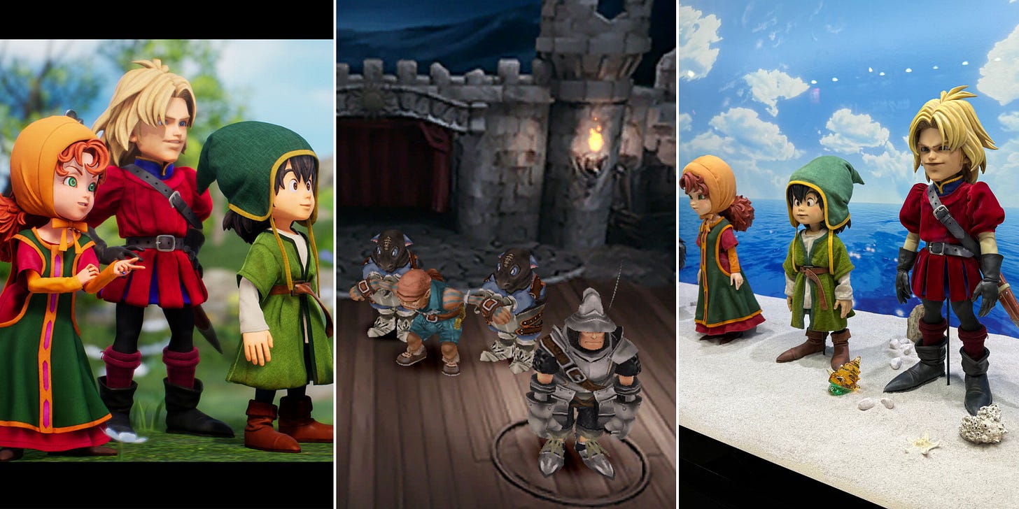 Il est amusant de constater que si les Final Fantasy ont abandonné le côté “poupée” des personnages de FFIX pour adopter le réalisme fashionista de ceux de FFVIII, le prochain remake de Dragon Quest VII, lui, ressemble de manière assez saisissante au dernier FF de Hironobu Sakaguchi. (FFIX au centre, DQ7 Reimagined à gauche avec, à droite, les poupées exposées au Tokyo Game Show 2025)