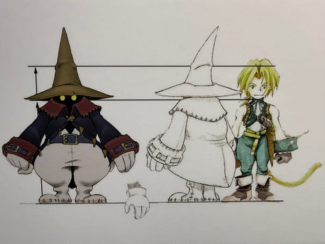 Quelques-uns des personnages centraux de FFIX : Zidane, avec sa longue chevelure blonde et sa queue de singe ; la princesse Garnet ; Vivi, le bouleversant mage noir et le personnage qui m'a le plus touché ; le rigide et "Buzz Lightyear-esque" (non ?) chevalier Steiner ; ainsi que la petite Eiko, superbement designée par Amano.