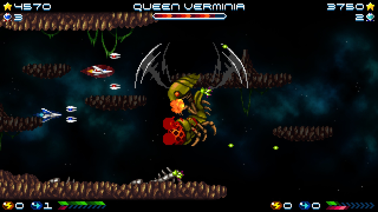 Voici une capture d’écran de la version Switch du très bon Super Hydorah (jouable à deux !) sortie en 2018 en téléchargement, mais aussi en boîte via l’éditeur espagnol Abylight.