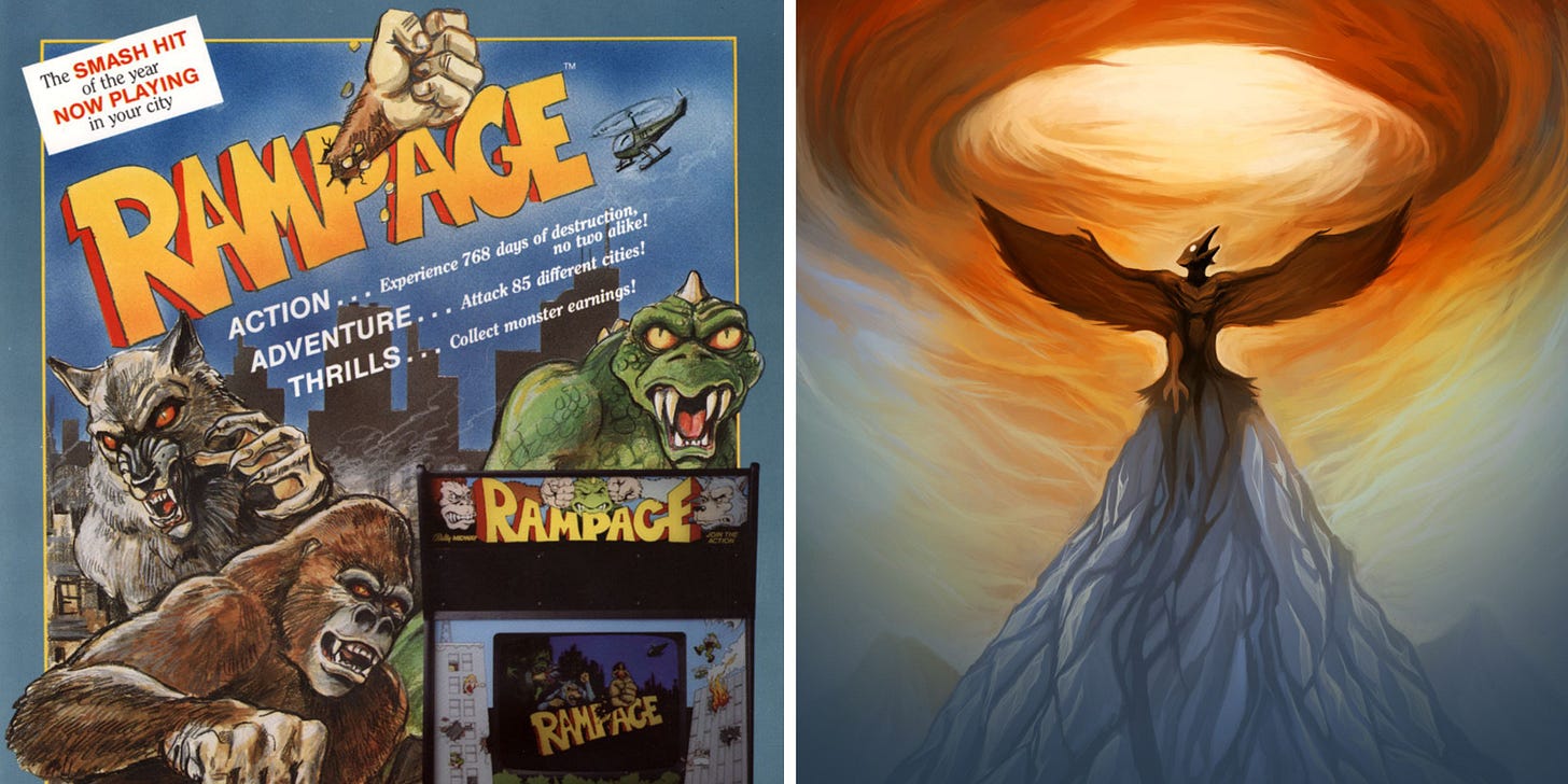 Rampage est un jeu d’arcade Bally Midway de 1986 où l’on incarnait 3 monstres géants (George, Lizzie, and Ralph : un singe, un lézard et un loup) au milieu d’immeubles à réduire en miettes ! Le visuel de droite est l’une des illustrations de Marek Barej réalisées pour Gaurodan.