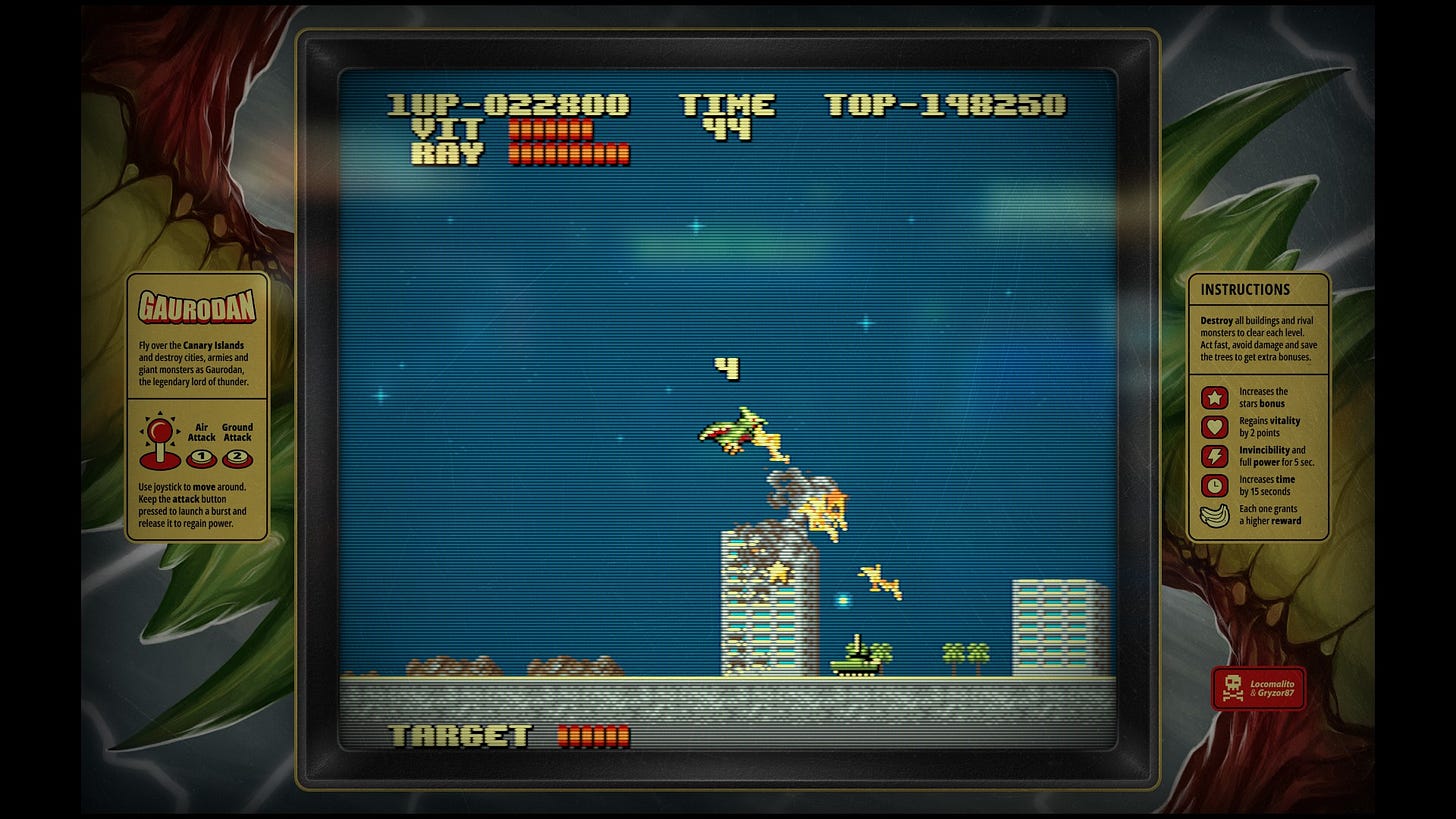 Alors foncez les découvrir si ce n’est pas encore fait ! En commençant par Gaurodan si vous jouez sur PC et aimez les kaiju, l’arcade et le pixel art autant que Locomalito !