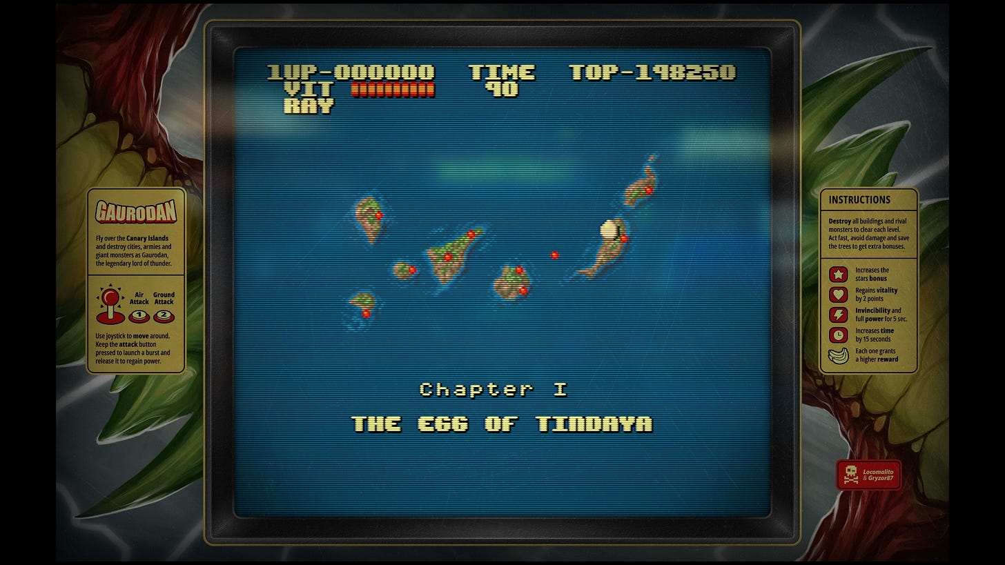 Mais l’amour de Locomalito ne se limite pas au kaiju eiga, soit aux films japonais mettant en scène des monstres géants. Il a aussi tenu à mettre en scène son propre patrimoine et en l’occurence la mythologie de l’archipel espagnol des Canaries. La carte du jeu reproduit d’ailleurs fidèlement l’archipel, dont les îles se prêtent à merveille au découpage en niveaux !