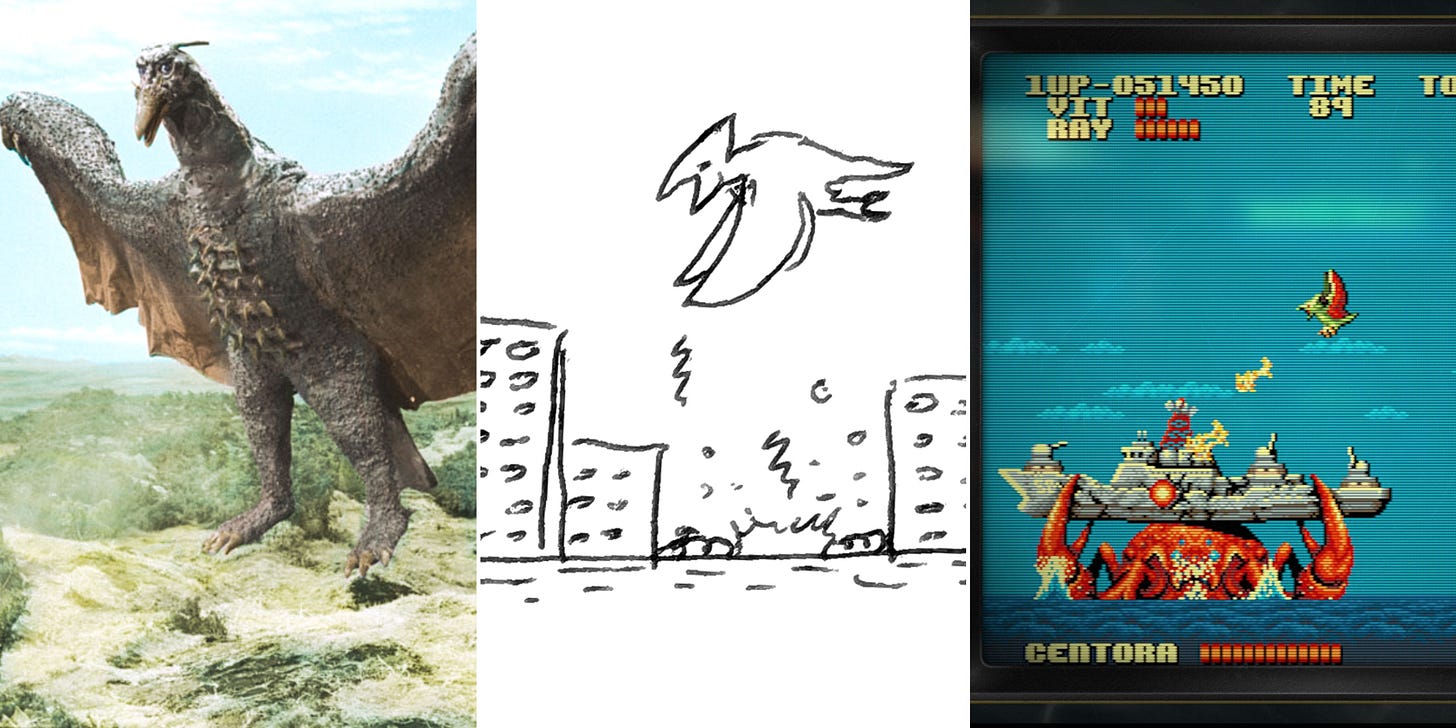 De gauche à droite : Rodan dans le film Toho de 1968 Les envahisseurs attaquent (Destroy All Monsters) ; au milieu un croquis réalisé par Locomalito ; et enfin une capture du jeu Gaurodan avec la version ré-imaginée du kaiju en plein combat contre un autre monstre géant !