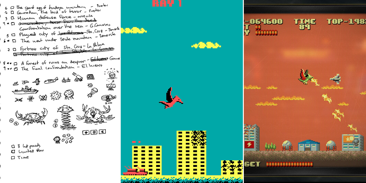 Quelques croquis préparatoires de l'intro de Gaurodan et du premier niveau du jeu. Des dessins que Locomalito a gentiment accepté de partager avec nous.