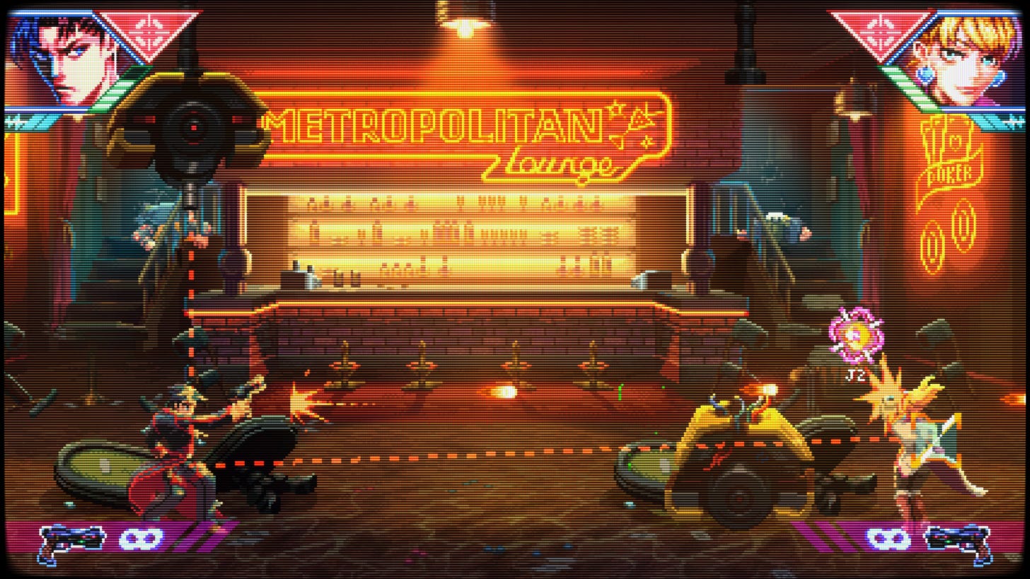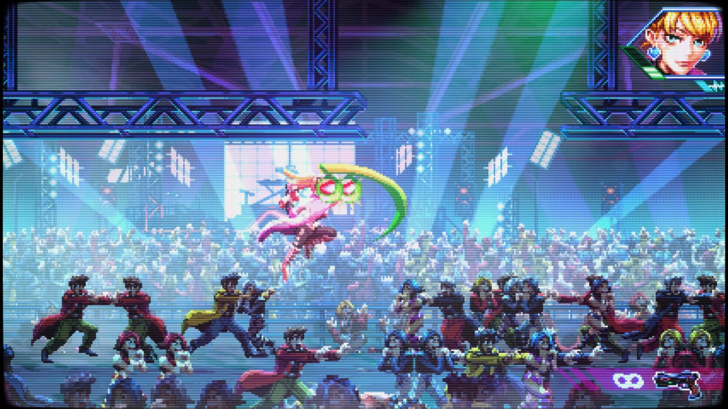 Neon Inferno avait TOUT pour me plaire. Un jeu au pixel art éblouissant et au gameplay nerveux, jouable en “coop’-canapé”, pour reprendre l’expression définissant ces softs que l’on peut apprécier à deux sur le même écran, comme Cuphead par exemple, ou Huntdown pour rester dans le genre run and gun. Un jeu, aussi, au parfum délicieusement années 80, comme l’attestent les références de Sri Kankanahalli.