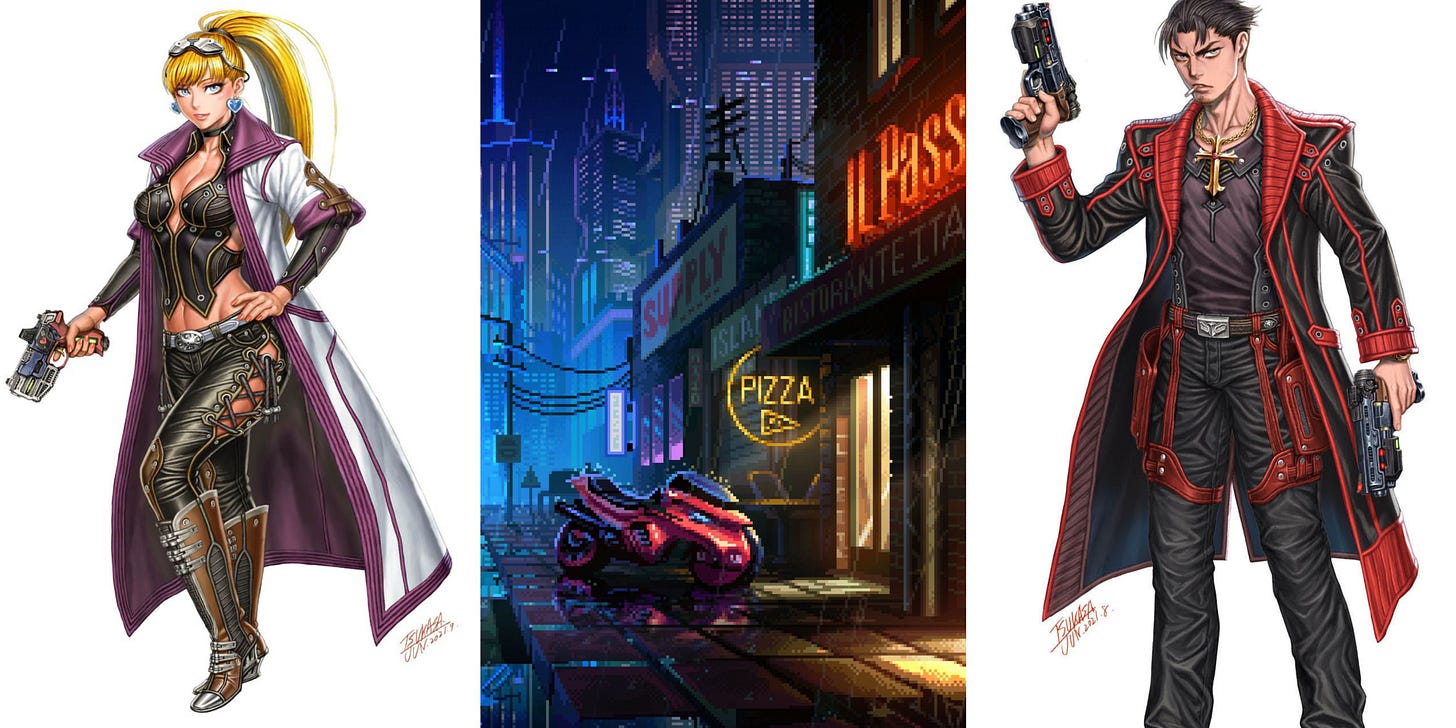 Les deux personnages jouables de Neon Inferno, Angelo Morano et Mariana Vitti, ont été dessinés par l’illustrateur japonais Jun Tsukasa. Au centre, l’un des somptueux décors créés par le français Christopher Anry.