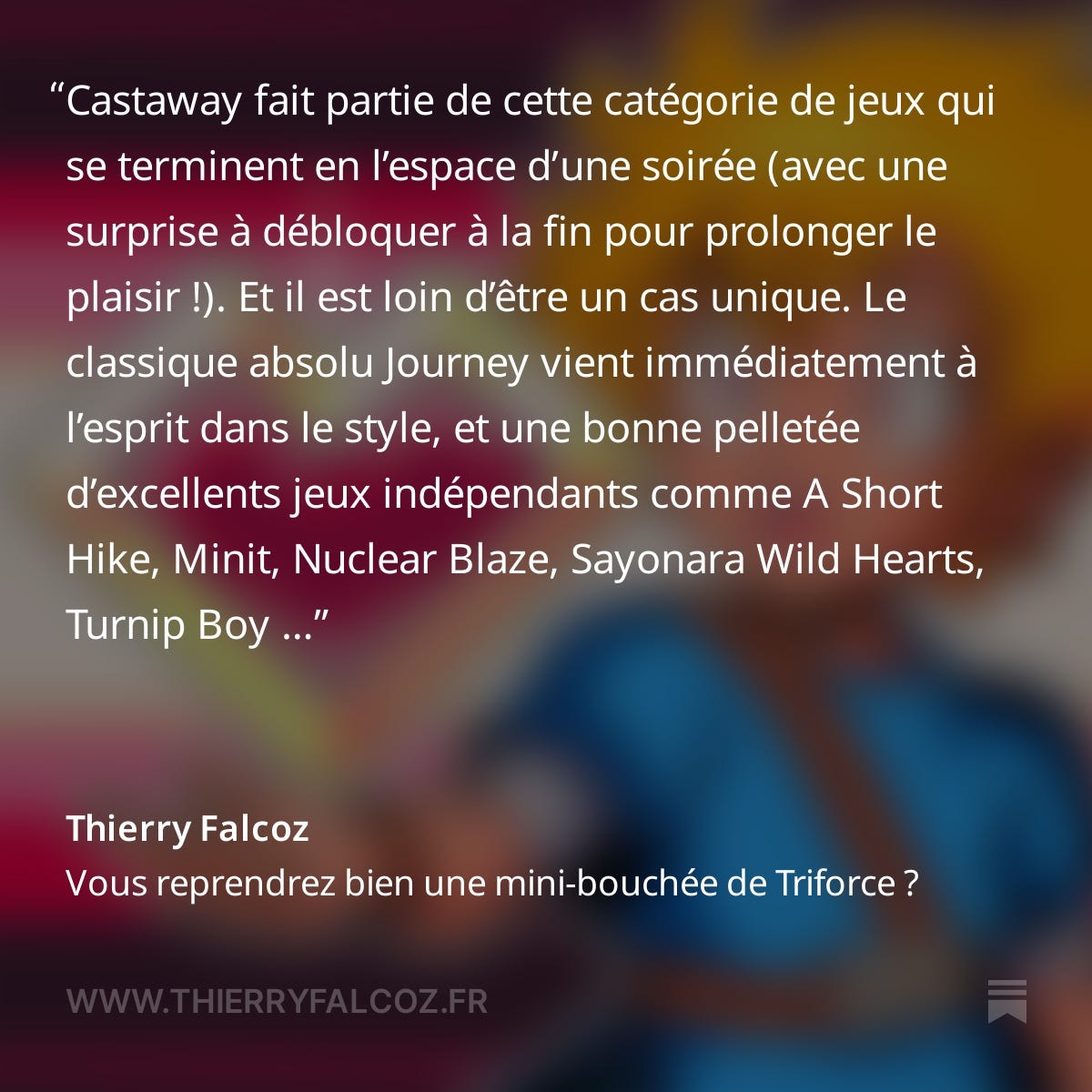 Il appartient donc à la vague de jeux indépendants privilégiant une expérience de jeu courte, comme Castaway par exemple, auquel j’avais consacré un article en 2024.
