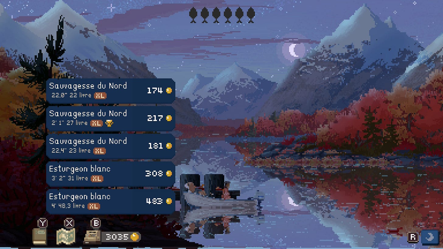 J’ai du passer une petite dizaine d’heures à lancer mes lignes au coeur des bulles de silence dispersées sur la carte du jeu. Percées par le bruit du moteur de mon bateau, les discrets et sporadiques “wouf !” de mon chien, et la mélopée du moulinet de ma canne à pêche, ces bulles n’ont jamais perdu de leur magie durant le temps passé à effleurer leur surface liquide.