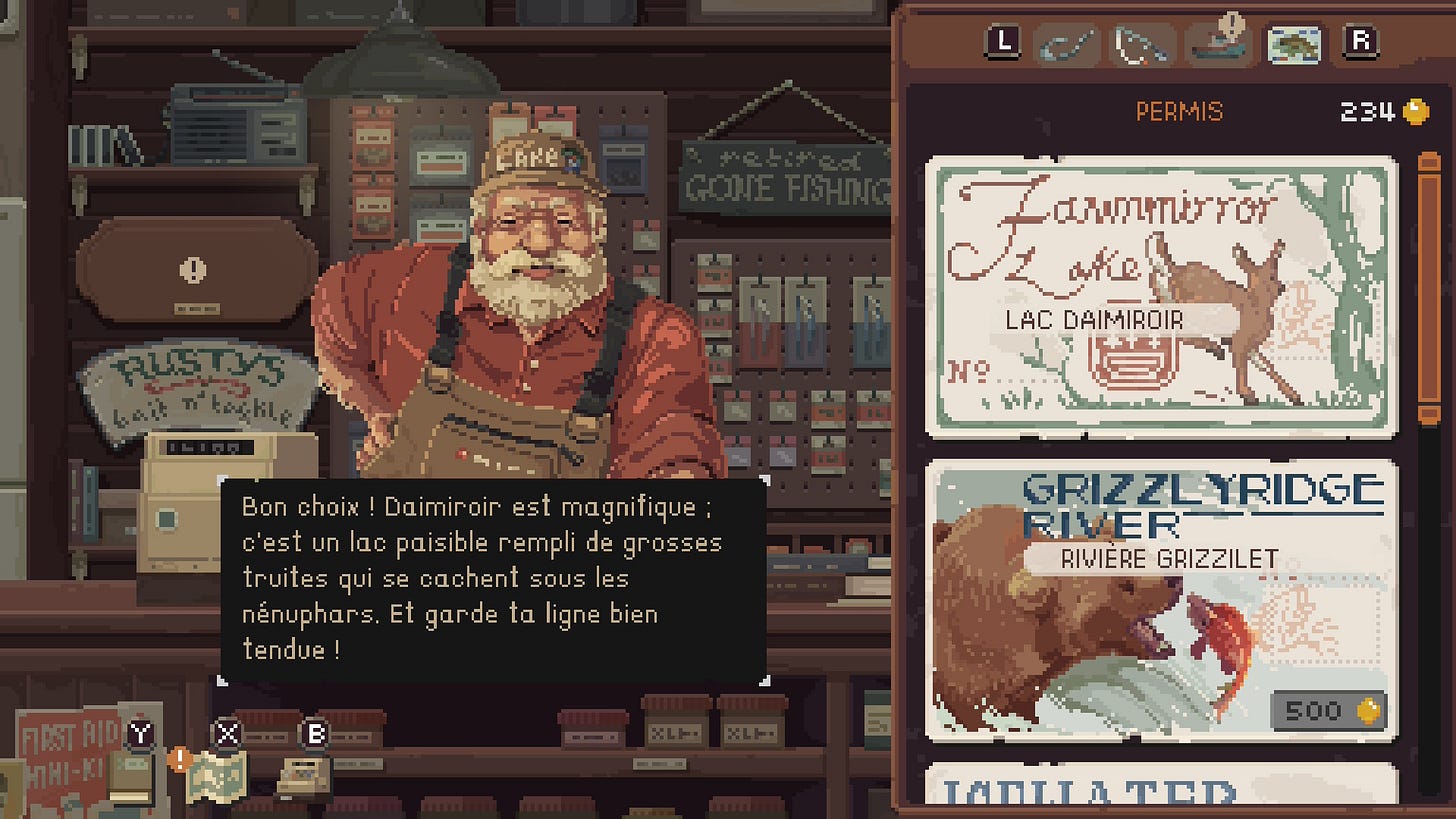Cast n Chill est parvenu à faire d’une mécanique répétitive et simpliste, un leitmotiv zen. Les piliers du jeu restent cependant terriblement capitalistes. Notre succès dépend entièrement du matériel acheté et donc de l’argent obtenu grâce à ses prises. Tom Nook1 serait fier du vieux marchand de la boutique de pêche !