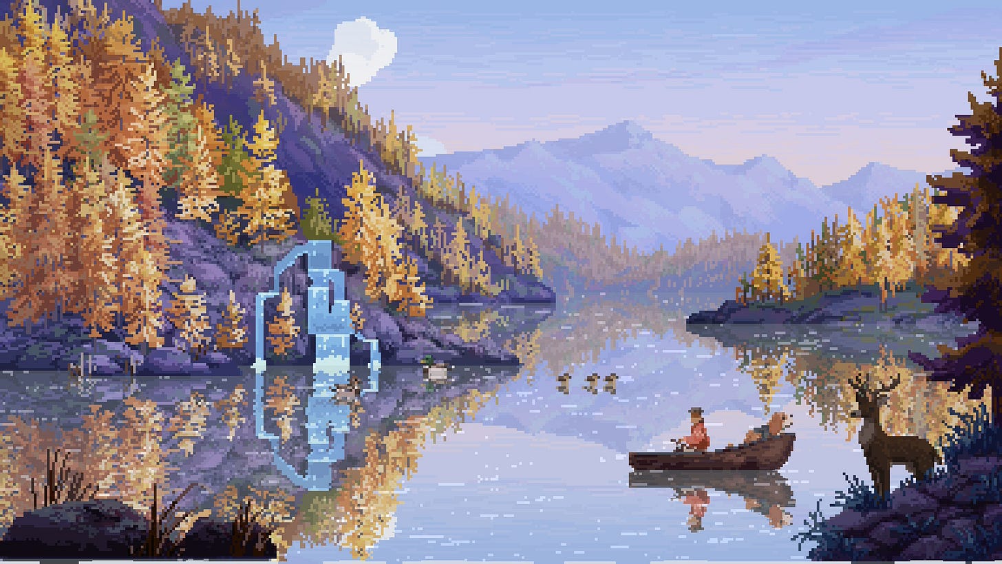 J’aurais aimé que la partie “Chill“ soit encore plus travaillée et explore davantage l’aspect sensoriel du jeu. Laisser glisser sa main en dehors du bateau pour sentir le frissonnement de l’eau sur ses doigts (à travers le retour haptique de la manette) ; pouvoir prendre des photos des animaux croisés dans la nature ; jouer avec son chien (ou sa marmotte, son panda rouge… bref, une plus grande variété d'animaux de compagnie !) ; ou focaliser son attention sur un son afin de révéler un oiseau dissimulé dans les arbres. Des idées de ce genre, destinées à travailler le potentiel immersif du jeu et tirer partie de ses superbes graphismes pixel art.