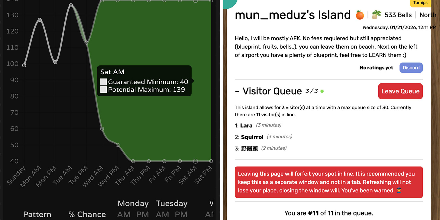 Ces extensions IRL du jeu, créées par des fans, m’ont fasciné. Surveiller un site comme Turnip Exchange pour tenter d’être parmi les premiers à rejoindre la file d’attente qui mènera à une île à l’autre bout du monde, est une aventure (qui ne se déroule pas toujours sans accroc… mais c’est une histoire pour un autre jour, où pour le prochain podcast !). Cet écosystème “hors du jeu” m’a amené à le laisser tourner en fond pendant des heures, afin d’être aussi réactif que possible au cas où une bonne affaire se présenterait !