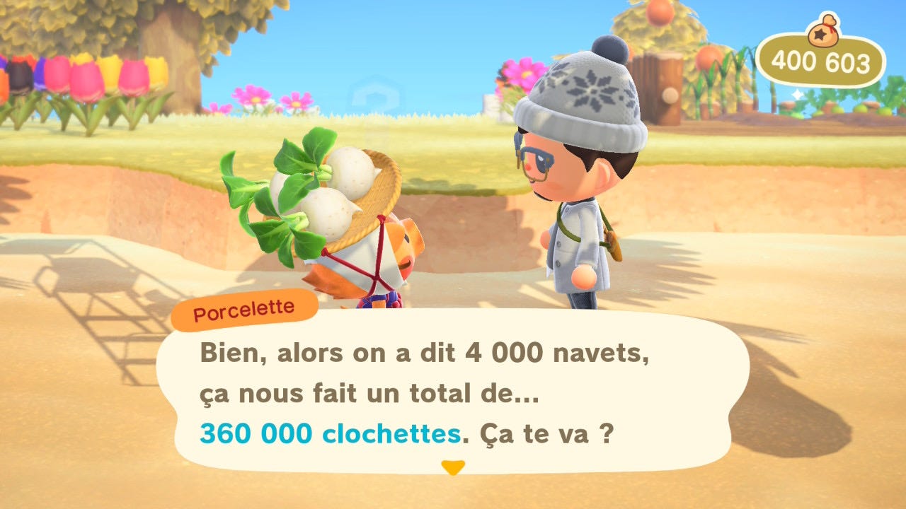 On peut les acheter tous les dimanches matins auprès de l’adorable Porcelette, pour tenter de les revendre la semaine suivante à un meilleur prix, ce dernier fluctuant deux fois par jour. Mais comme les navets pourrissent dès le dimanche suivant, il est impératif de parvenir à les vendre dans la semaine. D’où l’importance de Turnip Prophet ou Turnip Exchange, qui permet carrément d’aller visiter les îles d’autres joueuses et joueurs pour revendre ses navets à un bon prix !