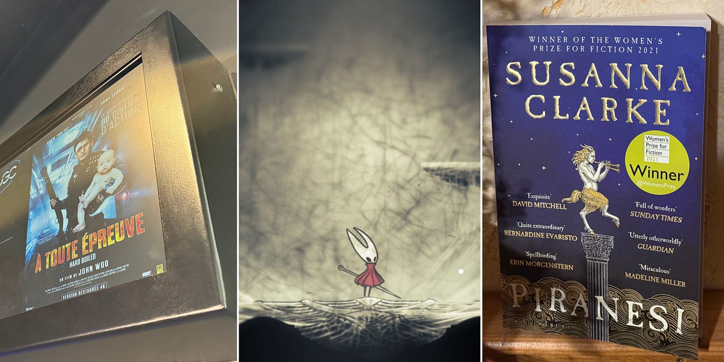 PS: Toutes les captures d’écran de Silksong ont été faites par mes soins à partir d’une version commerciale du jeu sur Switch 2. Un immense merci à mon épouse pour avoir tant insisté pour que je lise Piranesi. Un grand merci à Alex Pilot pour la photo de l’entrée de la salle diffusant Hard Boiled. Et puis aussi à Hakim pour m’avoir rappelé que le film serait en salles pendant mon séjour en France !