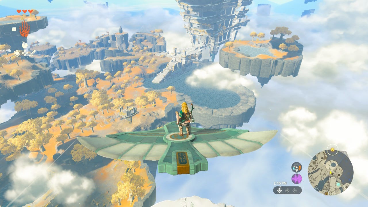 Ces 3 couches ont été pour Nintendo l’occasion de peaufiner et d’enrichir l’une des plus principales qualités du premier jeu : le plaisir lié à la navigation. Le paraglider (une espèce d’aile à l’aide de laquelle Link peut planer) fait ainsi son retour et les mécaniques de vol et de plongeon (épaulées par la présence de véhicules aériens) prennent une place centrale dans le gameplay du jeu. La première fois que l’on quitte la couche céleste pour littéralement plonger la tête la première à travers les nuages et découvrir la topographie familière d’Hyrule est inoubliable. Et le fait que l’on puisse réaliser un énorme plongeon du Ciel jusque dans les Profondeurs de la Terre sans temps de chargement visible est réellement épatant pour une console comme la Switch (la tortue des consoles de salon, pourtant bien loin devant - commercialement parlant - les lièvres next gen que sont les PS5, Xbox Series X et autres Steam Deck) et un testament de l’ingéniosité des programmeurs.