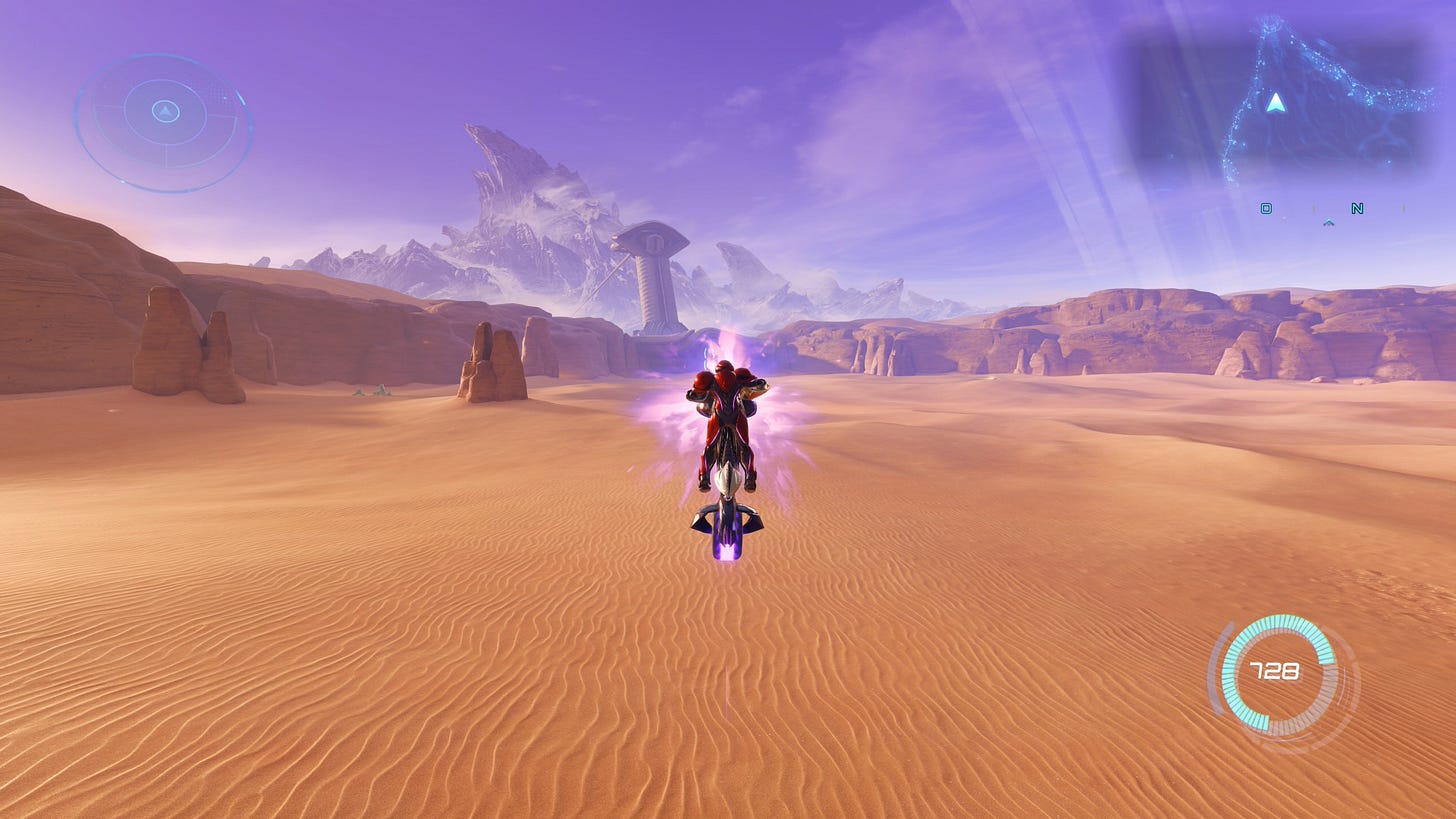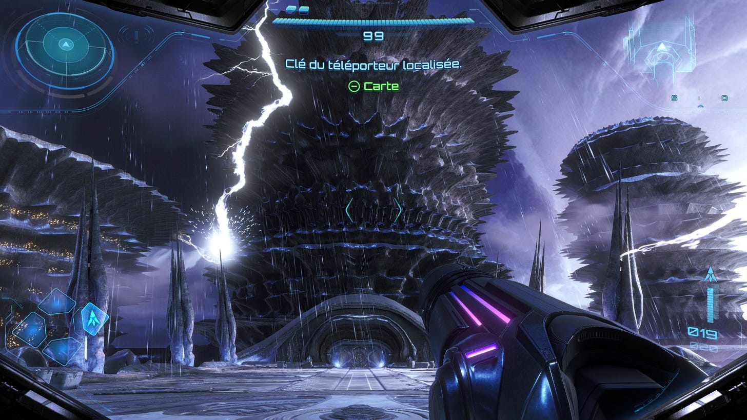 Trois gigantesques tours électrifiées, qui se ressemblent comme trois gouttes d’eau, où l’on doit parvenir à “débloquer” sa moto. Des décors démesurés, si terriblement vides et dépouillés… Des arènes en fait, typiques de la franchise Halo, qui semblent ici désincarnées. Parce qu’Halo est un First Person Shooter, là où Metroid Prime est un FPA - pour reprendre l’acronyme utilisé à sa sortie - soit un jeu d’aventure à la première personne.