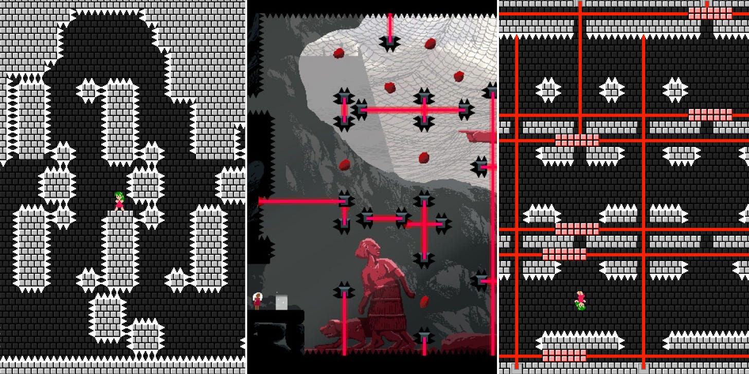 Minuscule, aussi fragile qu’agile, Maya est perdue dans des labyrinthes de pics. À leur contact, la mort est immédiate bien sûr, mais la résurrection l’est tout autant. Disciple de la formule éprouvée du die and retry, si chère au genre plates-formes et à sa sous-branche : le masocore platformer à la Super Meat Boy. On mourra ainsi encore et encore, même si le jeu échappe vite aux comparaisons et aux tiroirs dans lesquels il pourrait être rangé au premier coup d’oeil (nous y reviendrons, en restant vague pour éviter de trop spoiler).